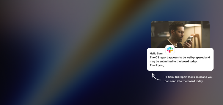 You just got off a call with your lead investor. You have three minutes before the next one. Two messages to send: one to your team in Slack, one to a new LP you've never met. One press each. Just say what you mean. SpeakON handles the tone.